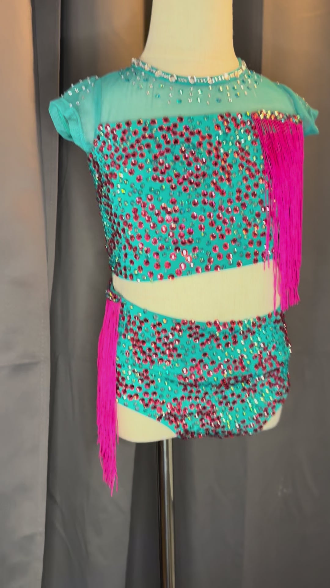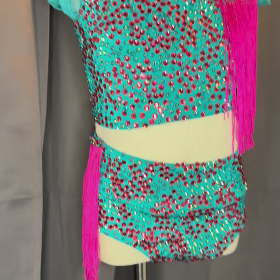 Make a bold statement on stage with Aztec Vibe, a vibrant aqua and hot pink costume designed for intermediate child sizing. Featuring striking hot pink fringe and a lively aqua base, this design brings energy, rhythm, and flair to every performance. Perfect for jazz, tap, or Latin-inspired routines, it’s crafted for comfort and flexibility while delivering eye-catching movement and color. An unforgettable choice for competitions and high-energy showcases.
