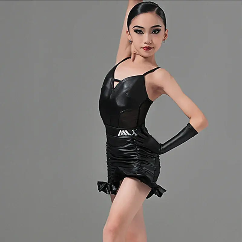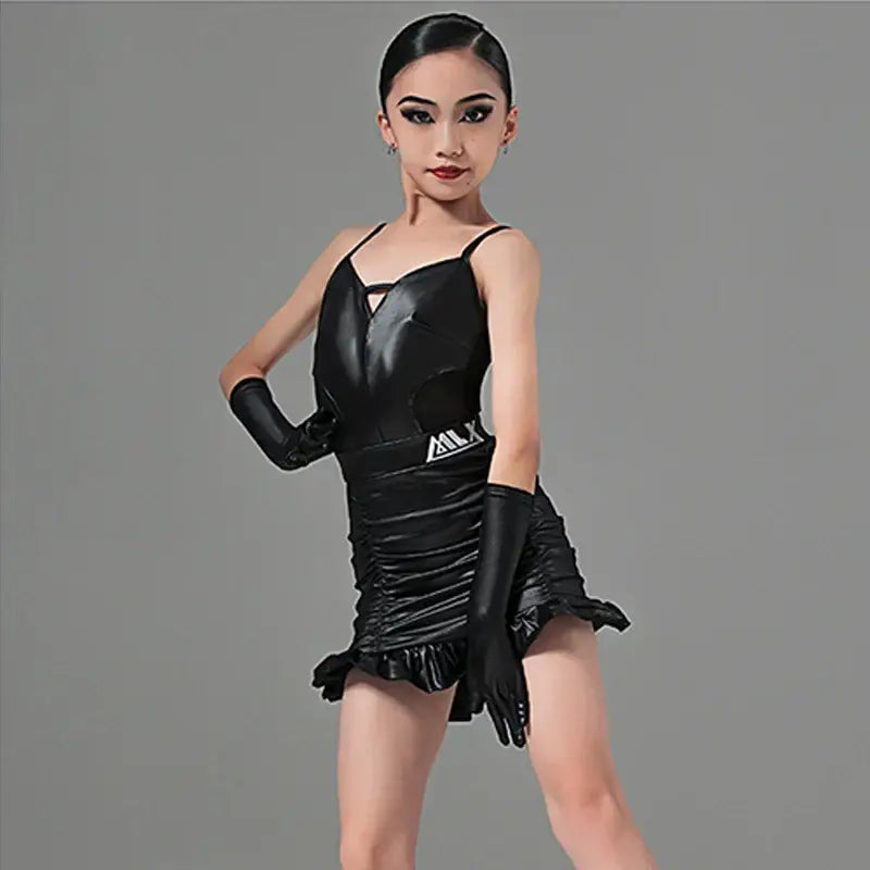 Black Leather Latin Dance Dress for Girls – Samba, ChaCha, Rumba, Salsa Competition & Training Costume