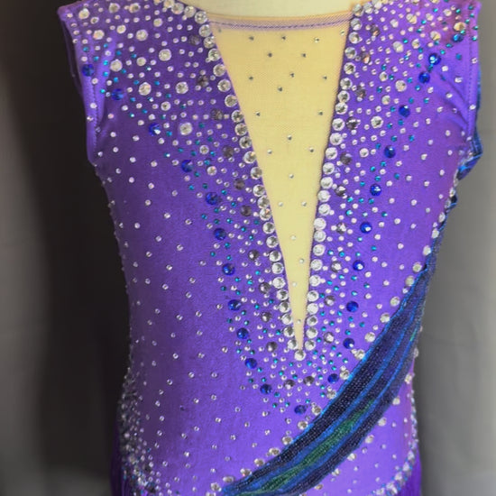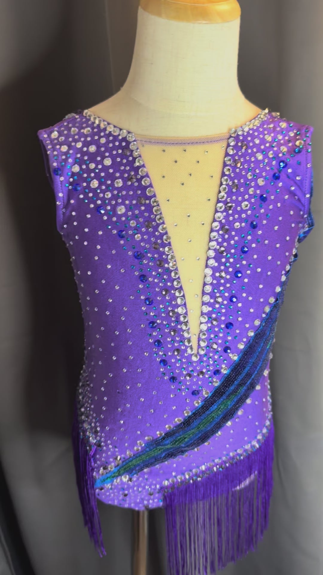 Cosmic Rhythm – Purple Jazz Fringe Dance Costume with Blue & Green Rhinestones and Wing Sequin Appliqué (US 6)