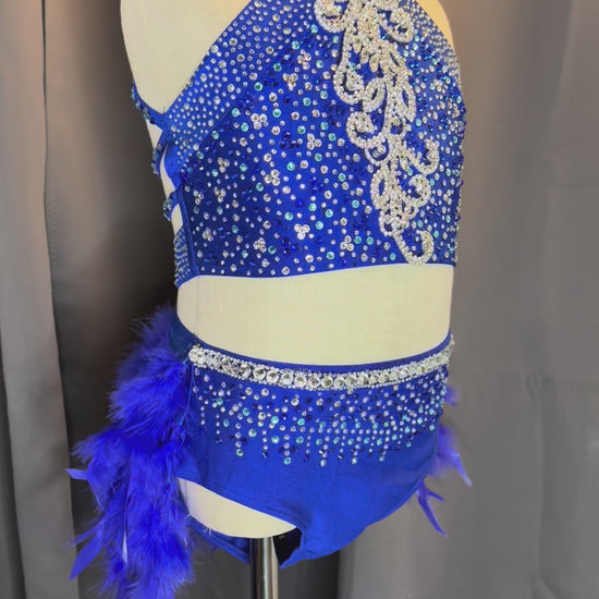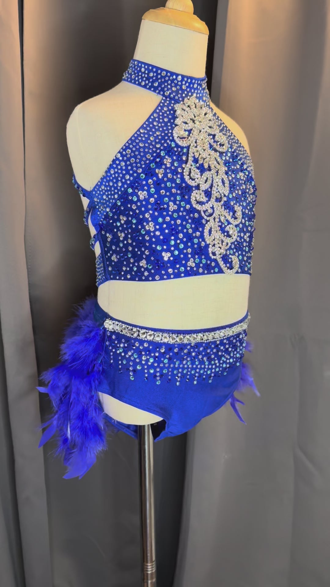 Command the stage in the breathtaking Sapphire Soirée, a royal blue masterpiece that exudes confidence, elegance, and star power. This one-of-a-kind costume is richly embellished with shimmering rhinestones that catch every beam of light, creating a radiant sparkle that can be seen from the back row. Soft feather accents add a touch of luxury and motion, flowing beautifully with each turn and extension.