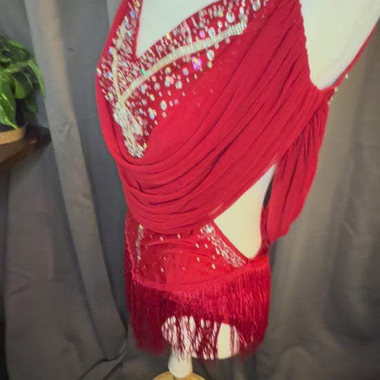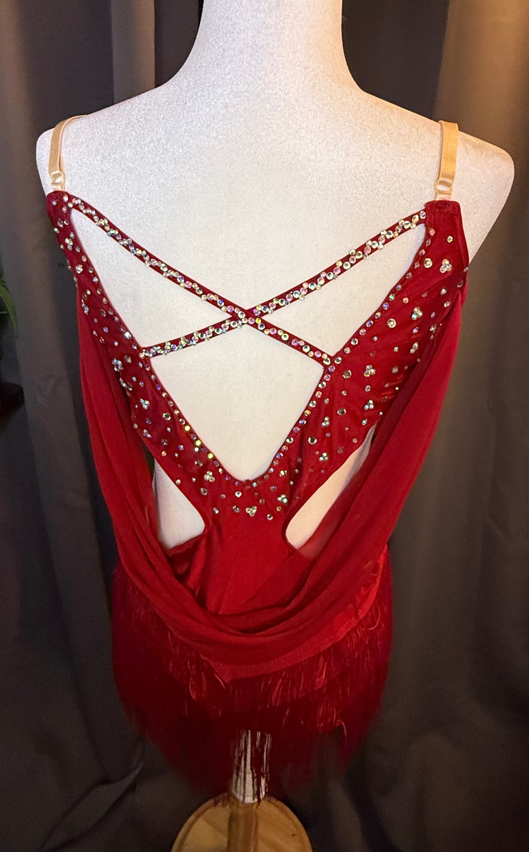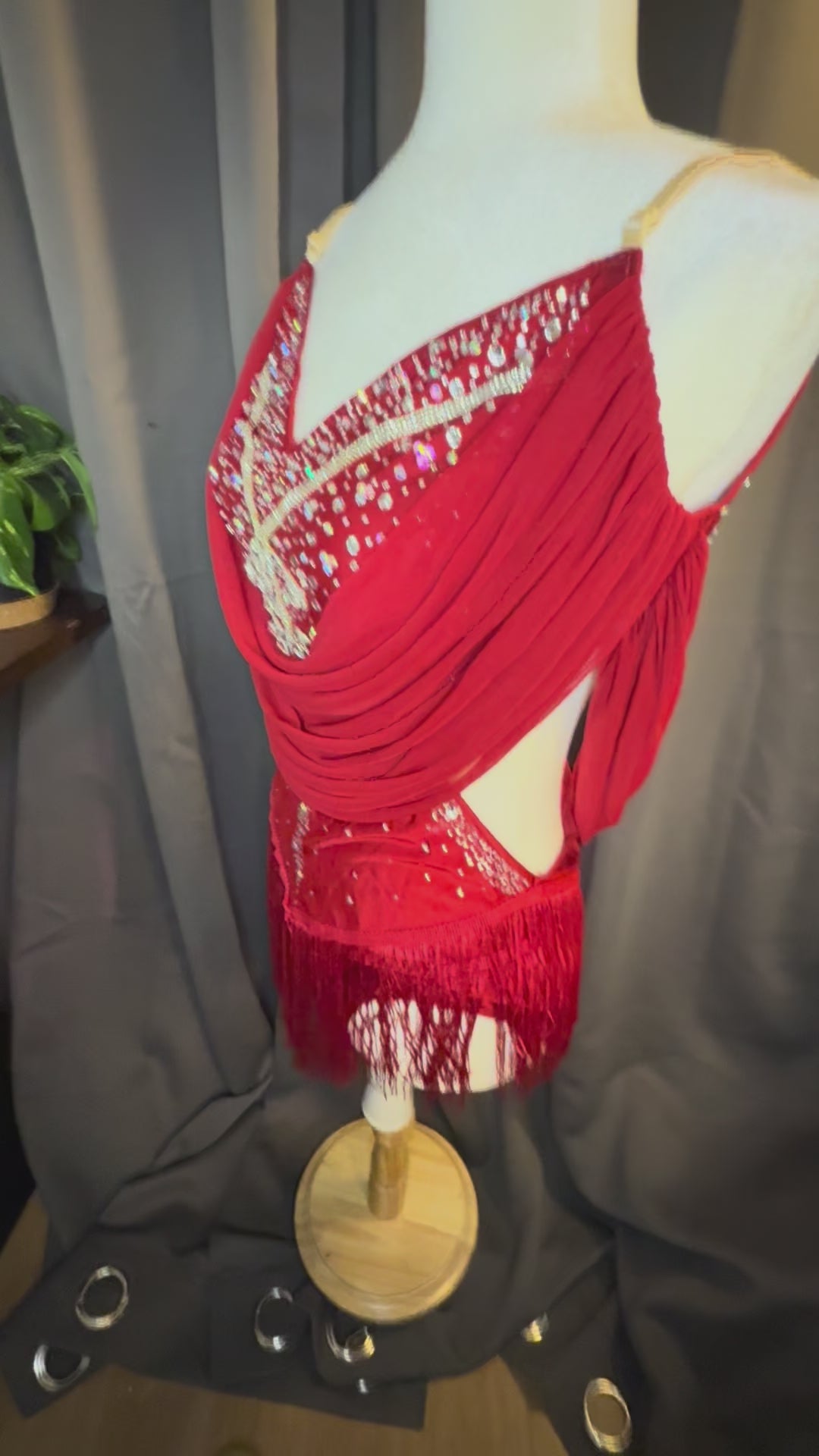 Radiate confidence and grace in Scarlet Cascade, a breathtaking red costume designed to captivate every eye in the audience. Crafted with real crystals that sparkle brilliantly under stage lights, this elegant piece features cascading chiffon drapes in the front and back that flow beautifully with each movement.