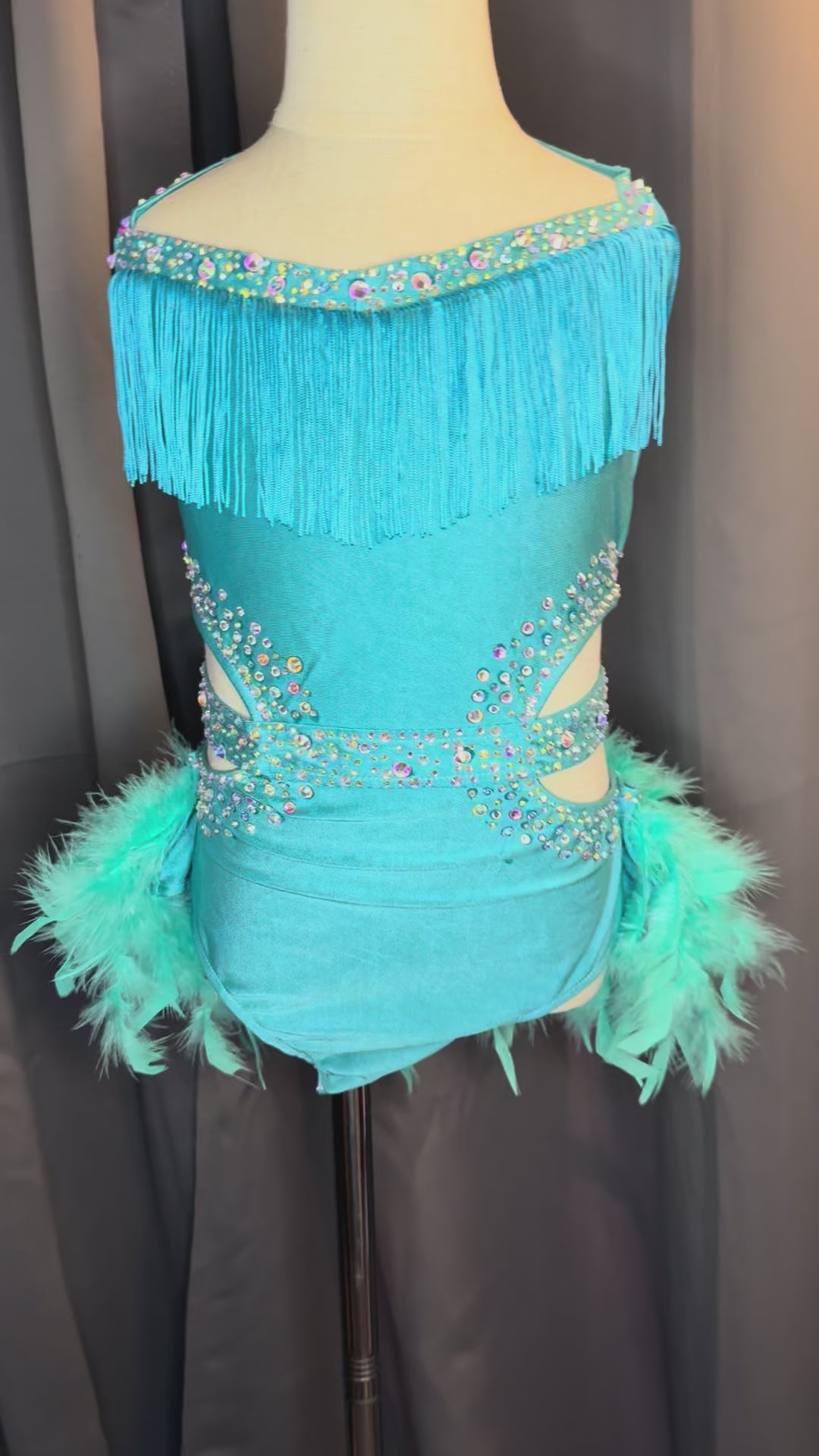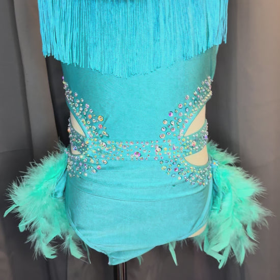 Step into the spotlight with Turquoise Mirage, a striking costume that blends elegance and movement. Featuring vibrant turquoise fabric accented with playful fringe and soft feather details, this design captures every turn, leap, and ripple of motion. Perfect for lyrical, jazz, or contemporary performances, it offers a captivating mix of texture and flow. Ideal for solos, duos, or trios where stage presence and artistry shine together.